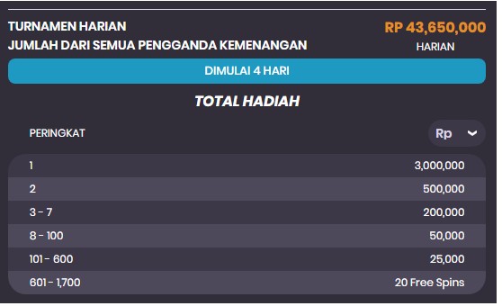 3. Turnamen harian akan berlangsung dari 20:00 hingga 23:59 WIB, dengan 1,700 hadiah harian senilai Rp 43,650,000. Akan ada 42 turnamen selama periode promosi.