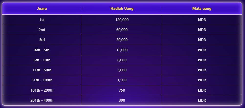 2. Total Hadiah IDR 1.500.000.000 akan dibagikan kepada 6,000 Pemain dengan skor tertinggi di papan peringkat.