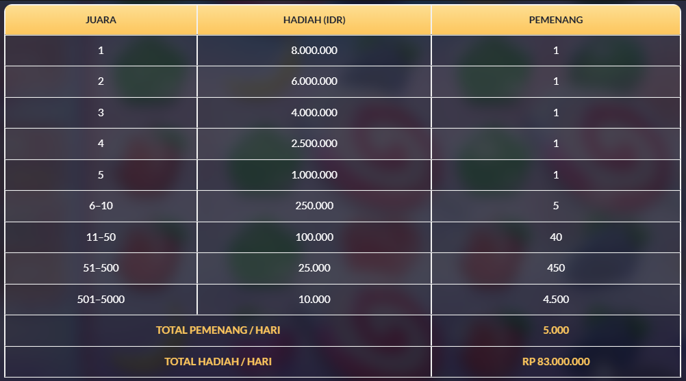 2. Total hadiah Rp 2,6 MILIAR akan dibagikan kepada 5.000 pemain setiap hari selama periode promo berlangsung.